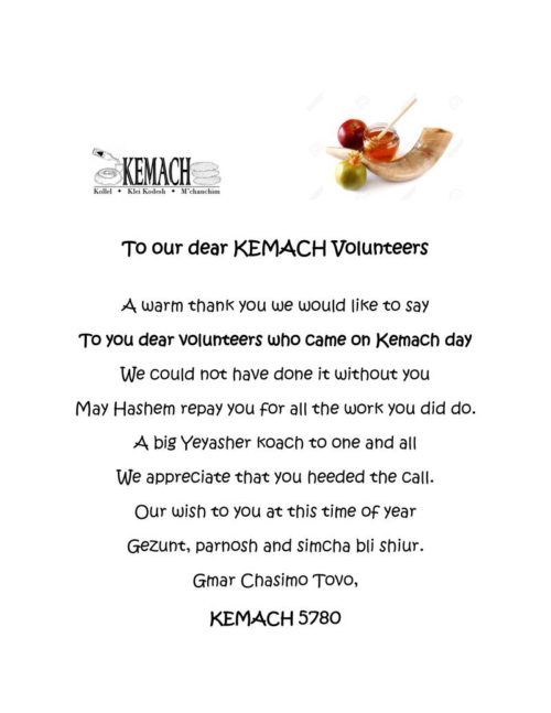 This Succos we want to thank YOU for truly making Yom Tov for other families who needed assistance this Yom Tov. To those dedicated drivers, succah builders, package deliverers, talented cooks, generous donors, visitors, and all those whose personal efforts have touched the hearts of the sick.. THANK YOU!!