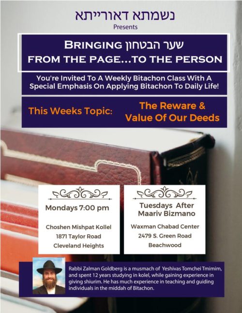 Shaar Habitachon Shiur With Rabbi Zalman Goldberg; Two Locations