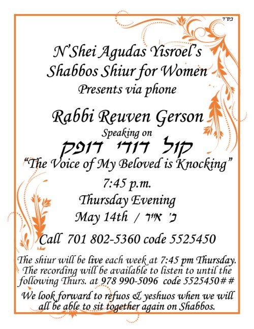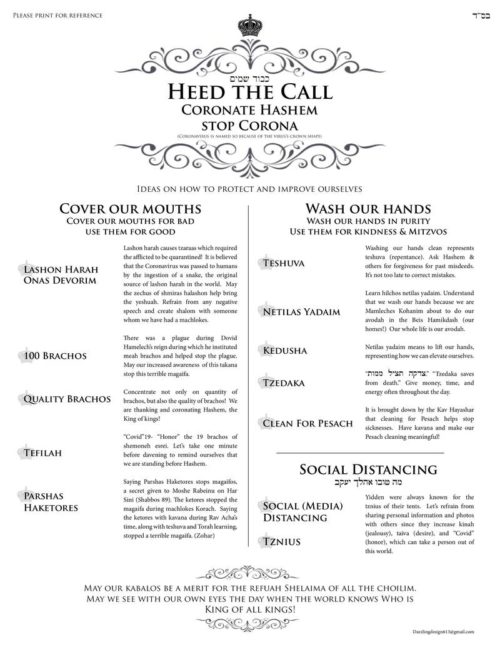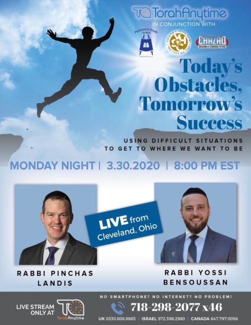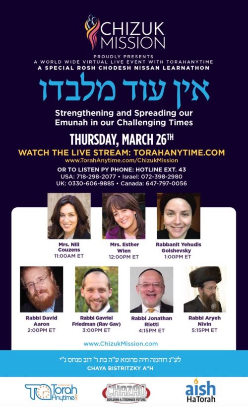 Tomorrow night, Mon., Mar. 23 at 8:30 pm EST there will be a teleconference given by HaRav Ahron Levitansky, shlita to discuss the current situation with insights and divrei chizuk.