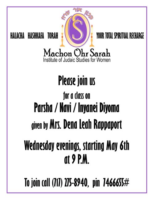 Machon Ohr Sarah Women’s Shiur Wednesday Evenings