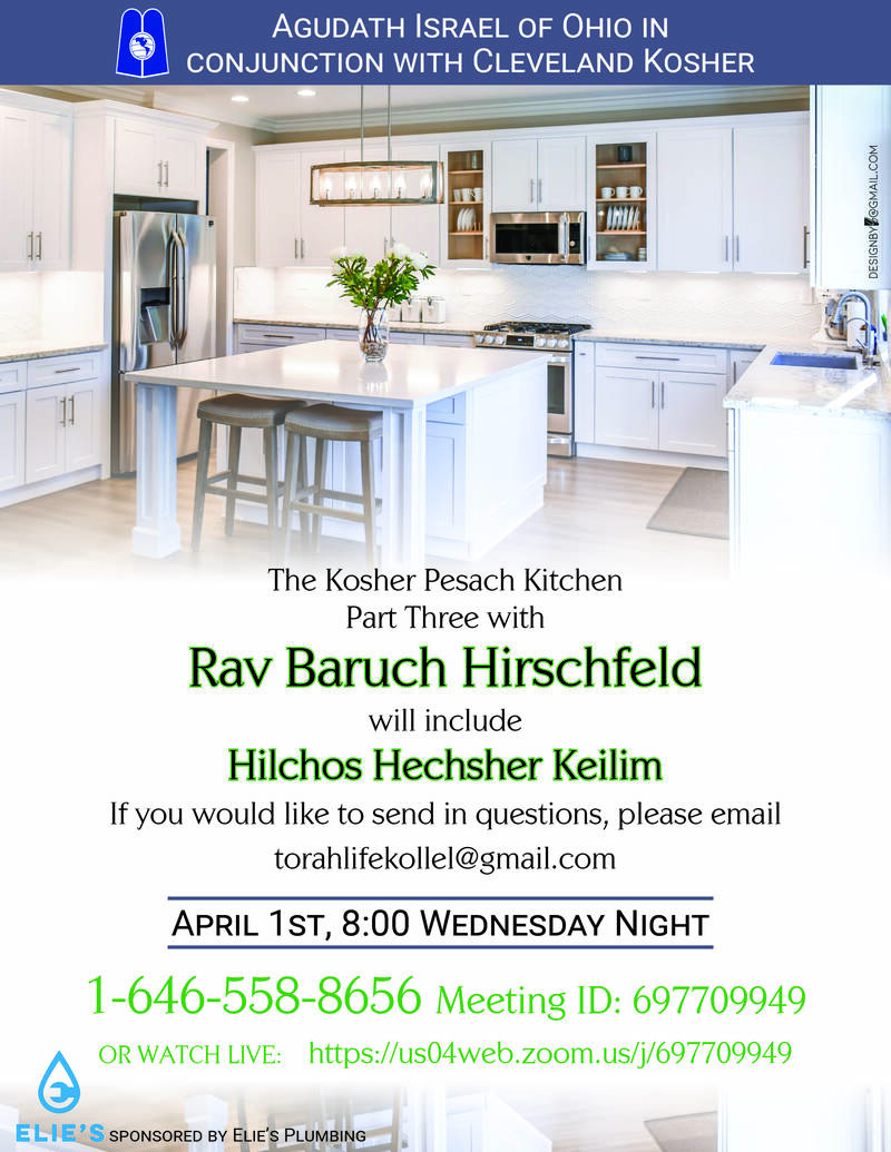Part 3 of “The Kosher Pesach Kitchen” with Rabbi Baruch Hirschfeld, 8pm, Wednesday Evening
