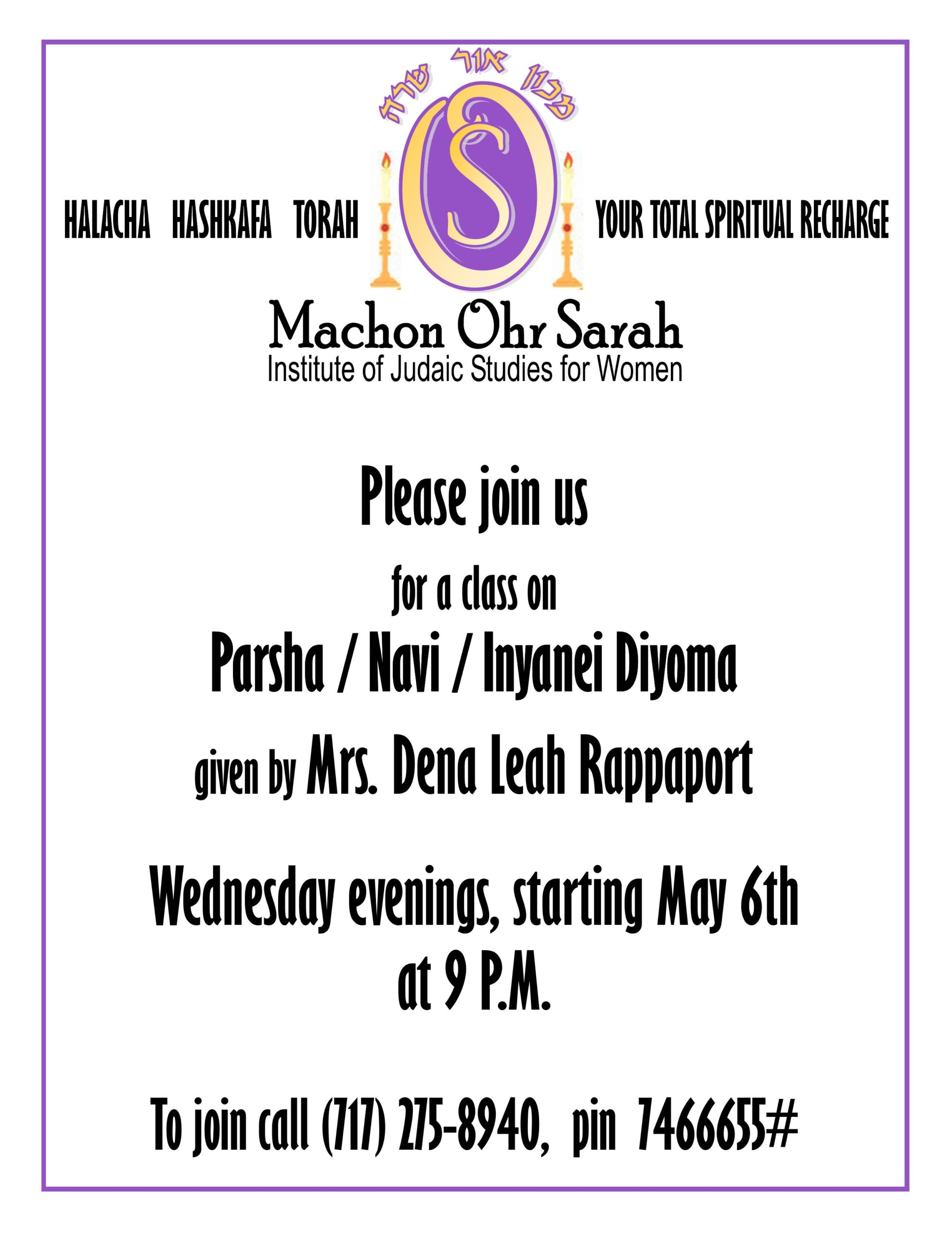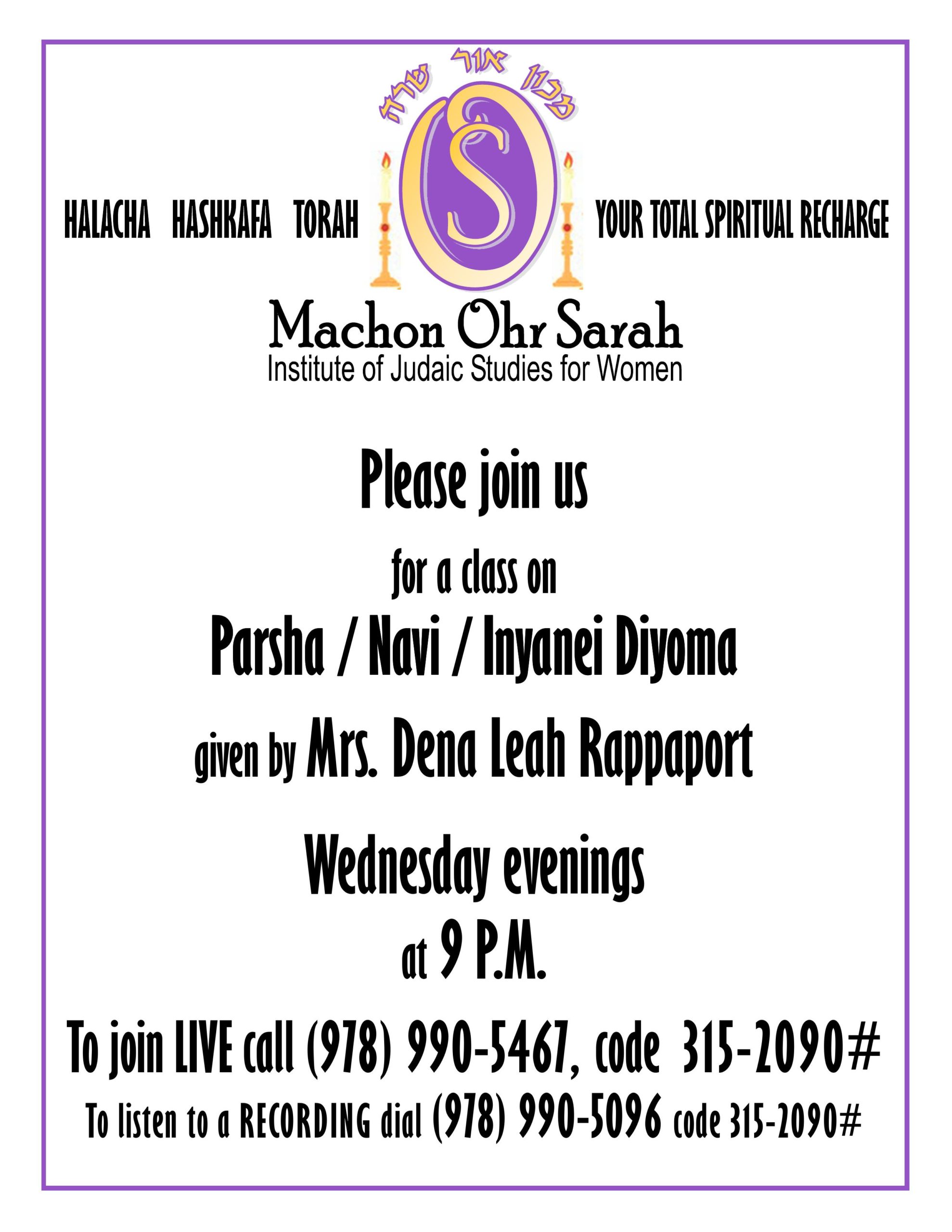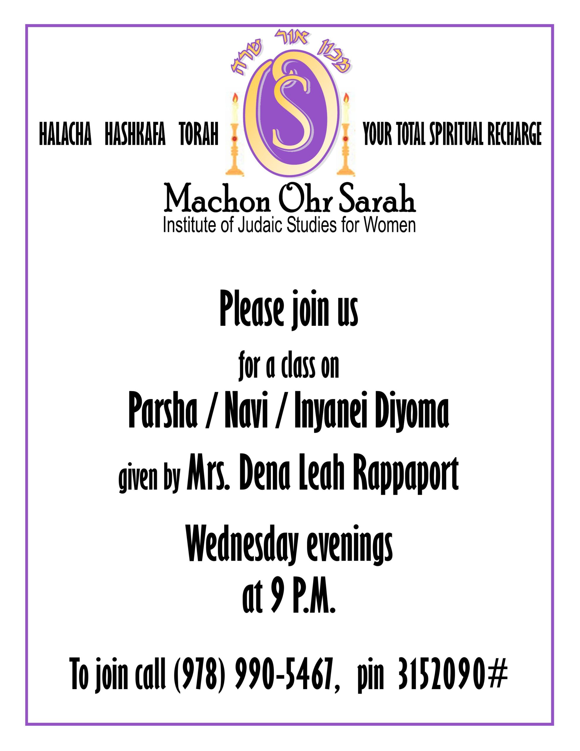 Women’s Shiur with Mrs. Dena Leah Rappaport, Monday