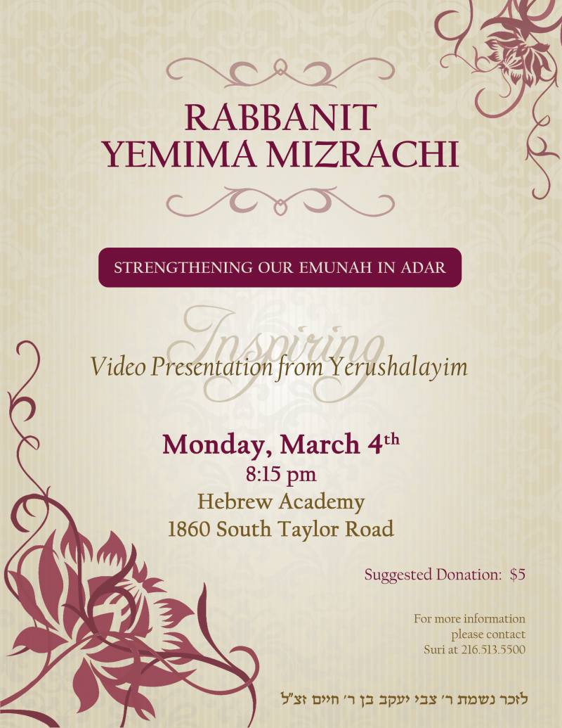 Rabbanit Yemima Mizrachi – “Strengthening Our Emunah in Adar”, Monday, March 4th