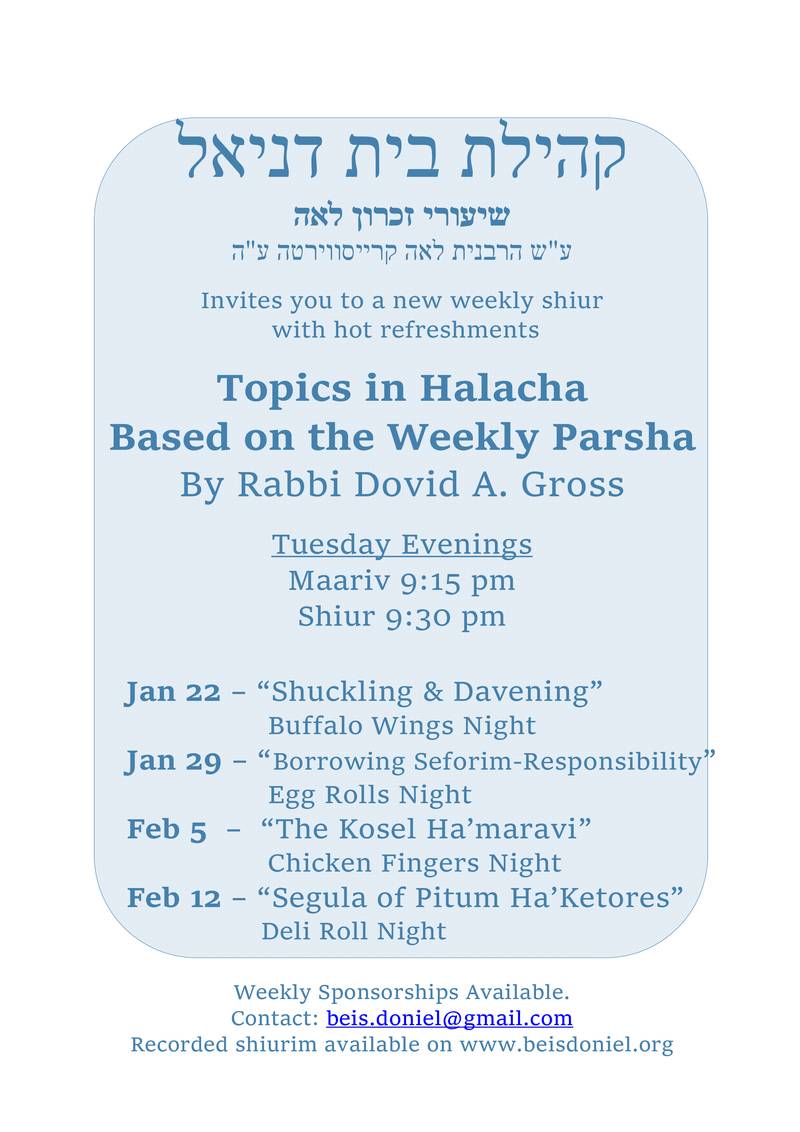 Beis Doniel Weekly Halacha Shiur By Rabbi Dovid A. Gross