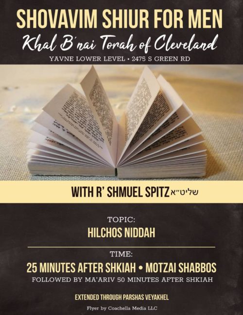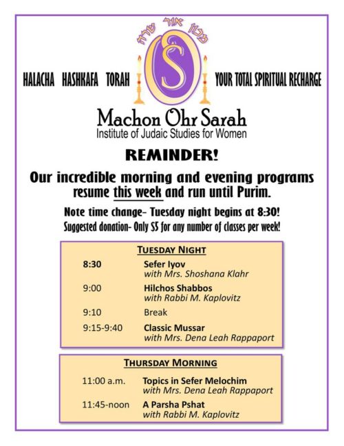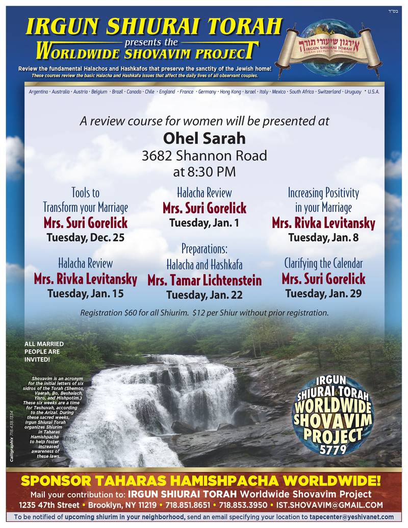Rabbi Yosef Heinemann will be giving an annual shovavim shiur which will cover some shalom bayis tips and a quick review of Hilchos Nidda. Bezras Hashem this Motzei Shabbos, January 19th, from 8:30-10.