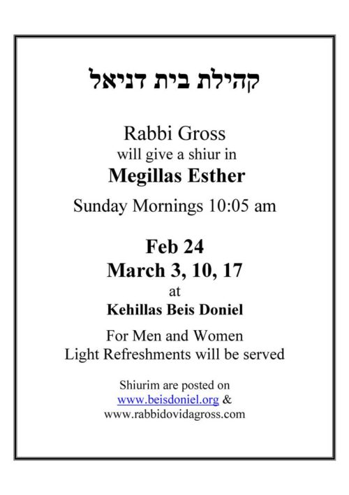 Megillas Esther Shiur for Men and Women, Sundays at Beis Doniel