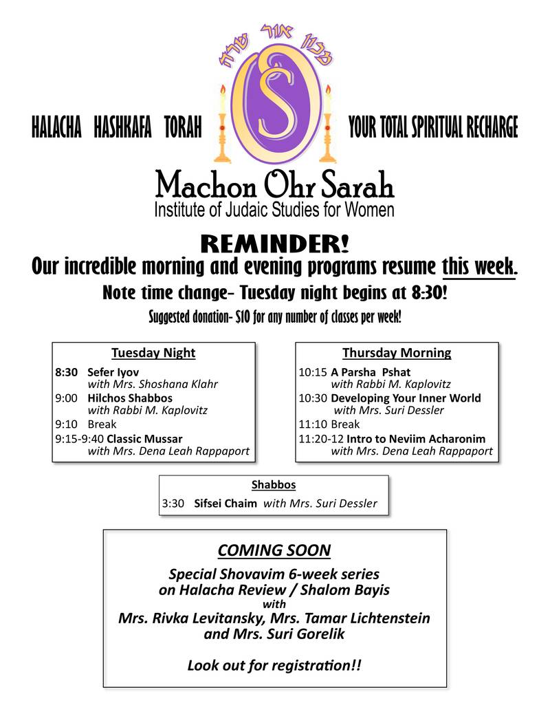 Machon Ohr Sarah Classes Thursday Morning and Tuesday Evening