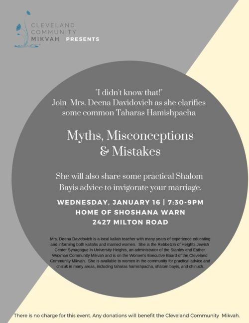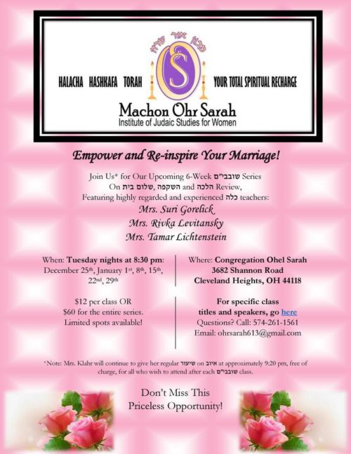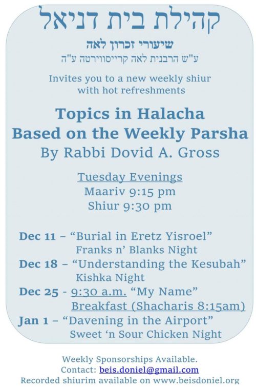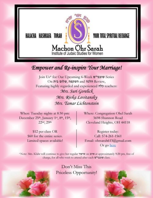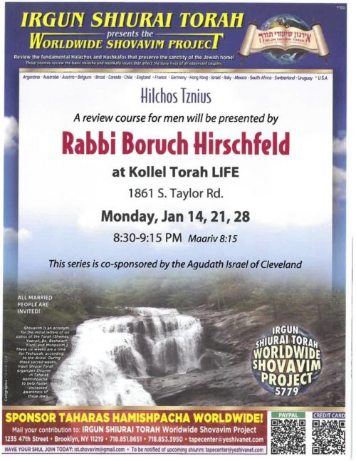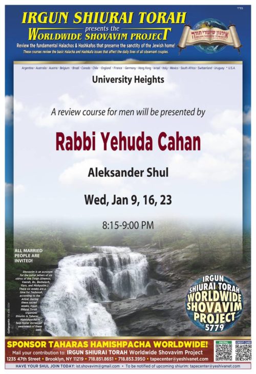 Rabbi Yosef Heinemann will be giving an annual shovavim shiur which will cover some shalom bayis tips and a quick review of Hilchos Nidda. Bezras Hashem this Motzei Shabbos, January 19th, from 8:30-10.