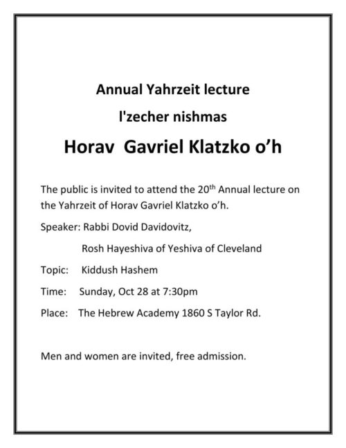 20th Annual Lecture on the Yahrtzeit of Harav Gavriel Klatzko, zt”l