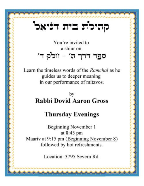 New Beis Doniel Hashkafa Shiur by Rabbi Dovid Aaron Gross, Thursday Evenings