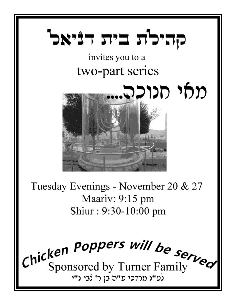 Kehilas Beis Doniel 2-Part Chanukah Series Tuesday November 20 & 27