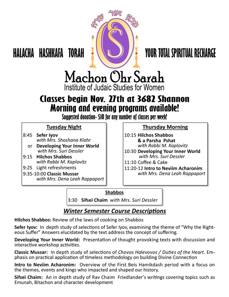 Machon Ohr Sarah Announces Our Winter Semester Schedule of Courses!