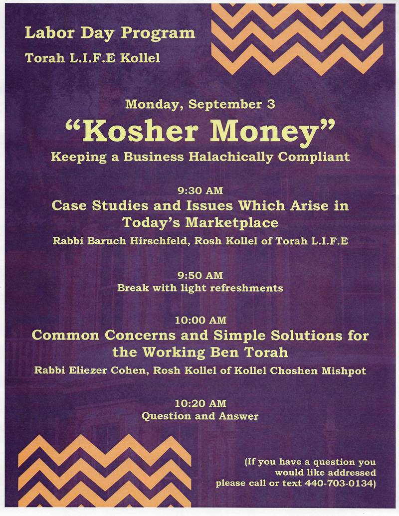 “Kosher Money – Keeping a Business Halachically Compliant” – Labor Day Program from Torah L.I.F.E. Kollel