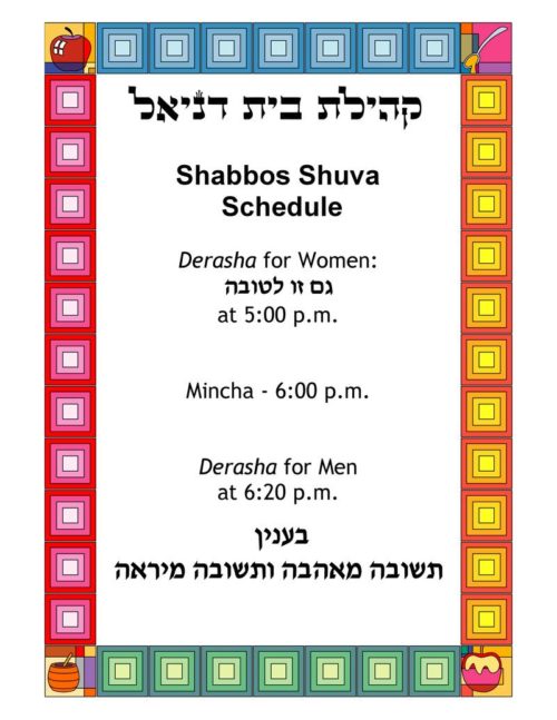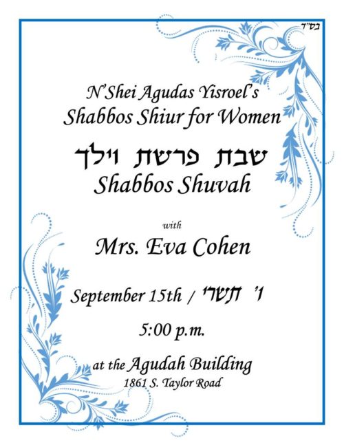 Shabbos Parshas VaYelech, September 15, 6 Tishrei, Rabbi Yehuda Cahan will be giving a Shabbos Shuva drasha.