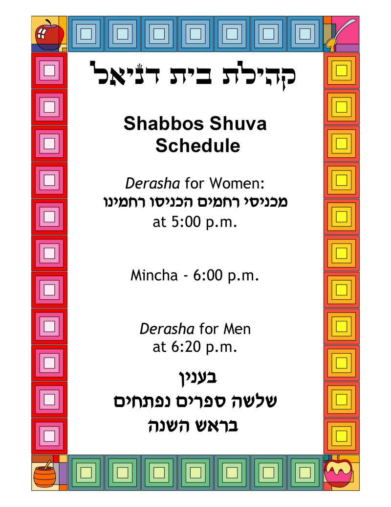 Shabbos Shuva Schedule and Drashos at Beis Doniel