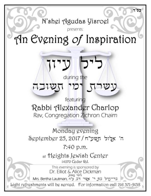 - Shabbos Shuva/ Teshuva Drasha for the Women of the community at 4:45pm at Rav and Rebbetzin Denciger’s home, 4380 University Parkway, University Hts.