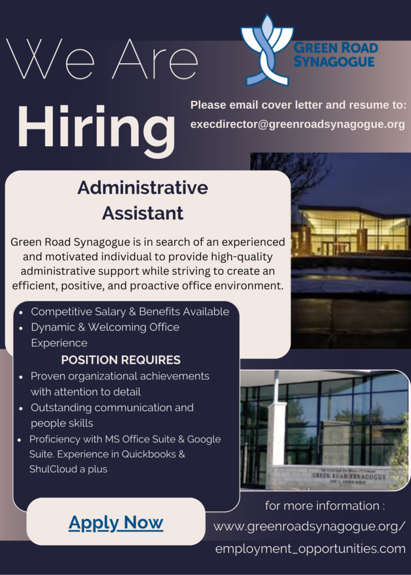 Green Road Synagogue is in search of an experienced and motivated individual to provide high-quality administrative support while striving to create an efficient, positive, and proactive office environment.