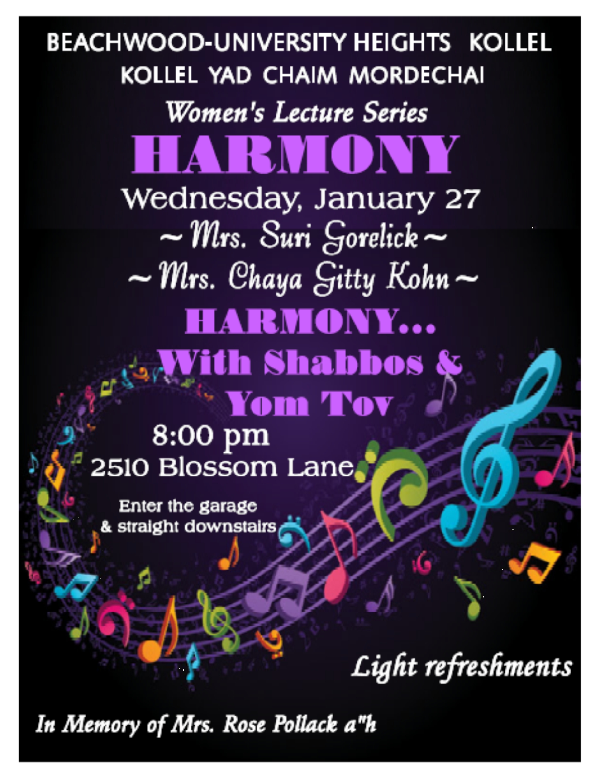 Beachwood University Heights Kollel – Women’s Lecture Series – Harmony – Wednesday Night
