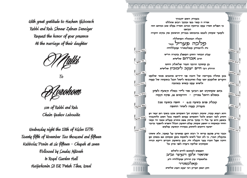 Please consider this wedding invitation (see attachment) as a personal invitation! For those who are planning to travel to Eretz Yisroel for the wedding, call (216) 245-7130 for all travel accommodations. We look forward to sharing Simchas with you!