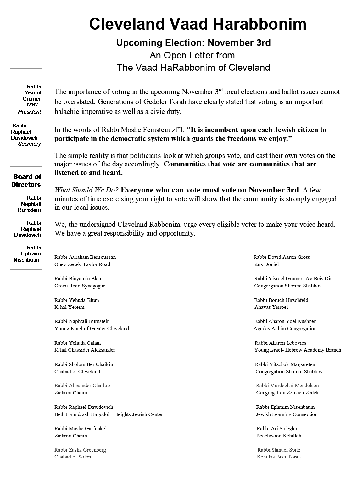 Cleveland Vaad Harabbonim Letter on the Upcoming Election November 3rd