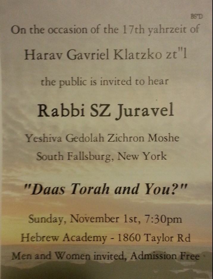 17th Yahrtzeit of HaRav Gavriel Klatzko, zt”l – Rabbi SZ Juravel
