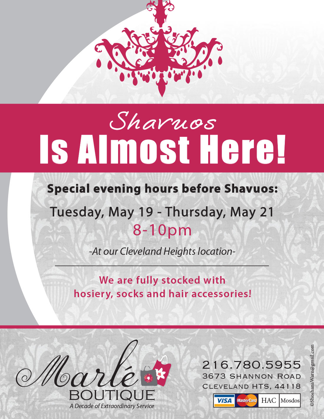Marle Boutique- Shavuos is Almost Here! Special Evening Hours