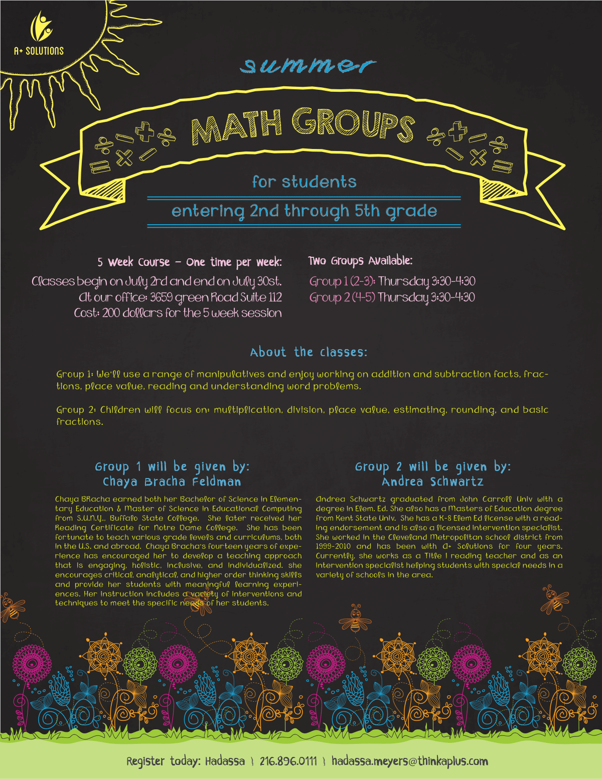 Bikur Cholim is selling bike helmets for $8 a piece. Available in Green, Red & Blue. Please call during office hours 9-1pm. You can also purchase helmets at our upcoming Children’s Health & Safety Fair on Sunday, June 28, 2015. To purchase call the office at 216-320-1771– from 9-1pm. Otherwise you can leave a message.A+ Solutions Summer Math Groups