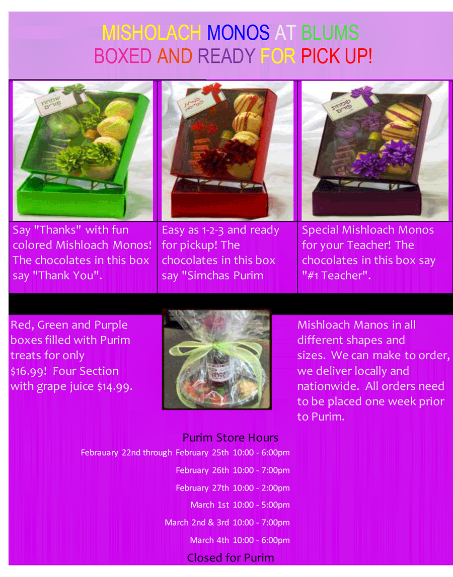 llie’s is your one-stop shop for Sh’lach Manos! Let us custom make your Sh’lach manos bags, with our delicious chocolates, fresh homentaschen, caramel corn, dried fruits or candy. Free delivery up to 5 miles from Ellie’s if you get your order in by March 1st. (216) 381-5577.