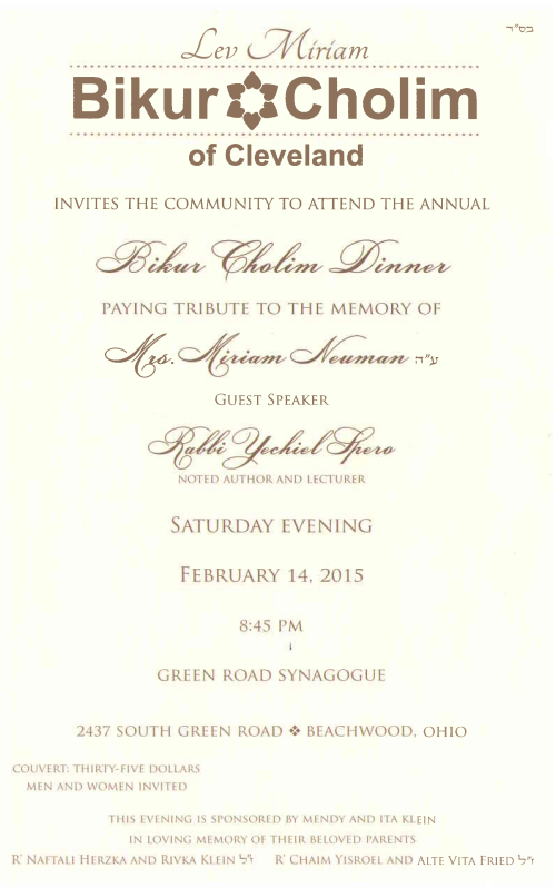 Bikur Cholim of Cleveland invites the community to attend the Annual Dinner paying tribute to the memory of Mrs. Miriam Neuman, a”h. Guest speaker: Rabbi Yechiel Spero. Saturday Evening, February 14, 2015. 8:45pm at Green Road Synagogue. Send in your reservations today: bikurcholimcleveland.org or call 216-320-1771.
