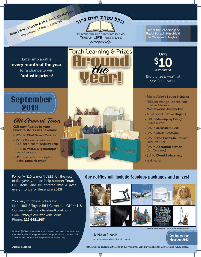 Every month in 2013, Torah LIFE Kollel, under the leadership of Rabbi Boruch Hirschfeld, raffles off fantastic prizes! Every prize is worth $500- $1000 dollars! For ONLY $10 a month, or $25 for the rest of the year, you can be entered into the monthly raffle, and you will have the zechus of supporting Torah. This month’s raffle is gift certificates to many local stores (over $900 value). (over $900 value)!