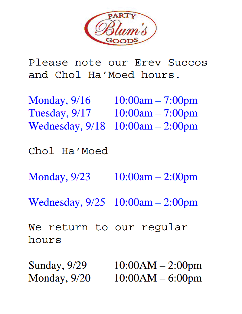 Blum’s Erev Succos and Chol Ha’Moed Hours