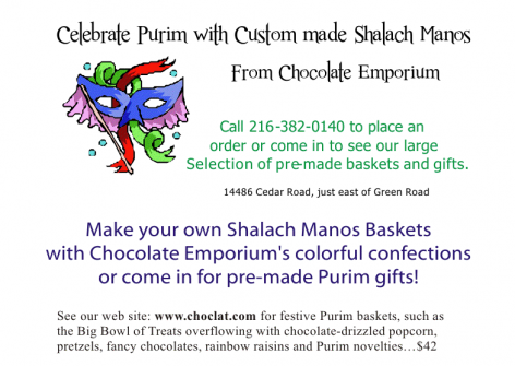 Beautiful chocolates will enhance any mishloach monos basket. Chocolate Purim lollipops will thrill the children. We sell foil wrapped chocolate Purim gelt, colorful chocolate hamantaschen, colorful chocolate Purim masks and flags, chocolate smiley faces, sprinkled pretzels and yummy chocolate popcorn, even dipped Pashkez sandwich cookies topped with a Purim mask. Confections can be bagged individually, foil wrapped or used to enhance a cellophane wrapped tray. Foil wrapped Purim masks can be used for table candy at your Purim Seuda. Just call 216-321-1131.