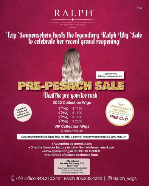 Ralph Wigs Pre-Pesach Sale at Wigs by Tzip this Sunday!