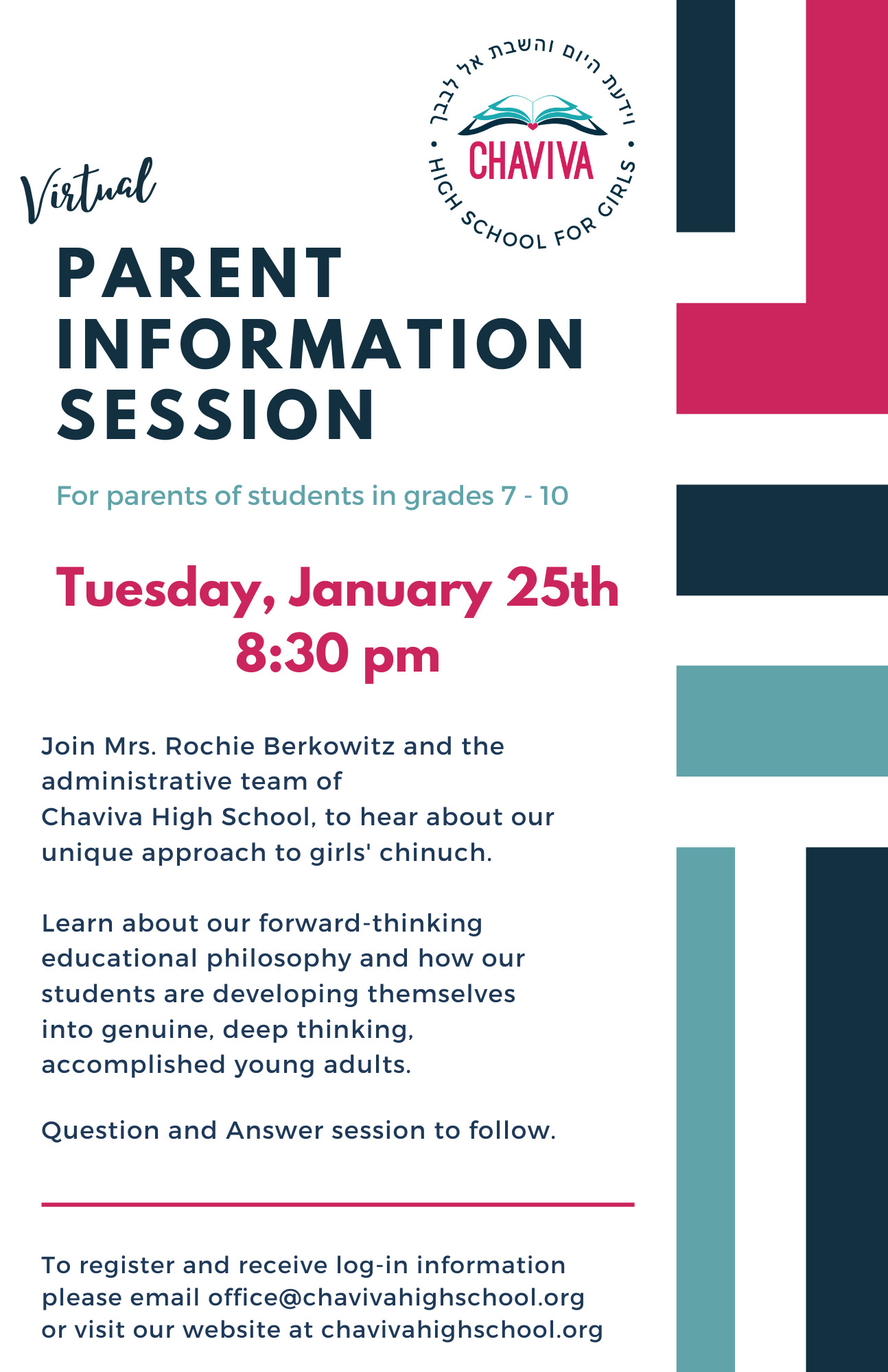 Chaviva High School Virtual Parent Information Session, Tuesday, January 25th