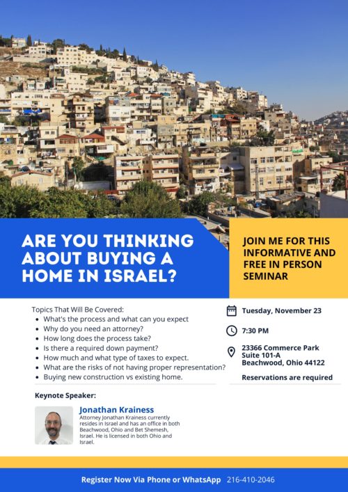 Considering Buying a Home in Israel? Join Jonathan Krainess, Esq., for a Free, In-Person Seminar Tuesday, 11/23