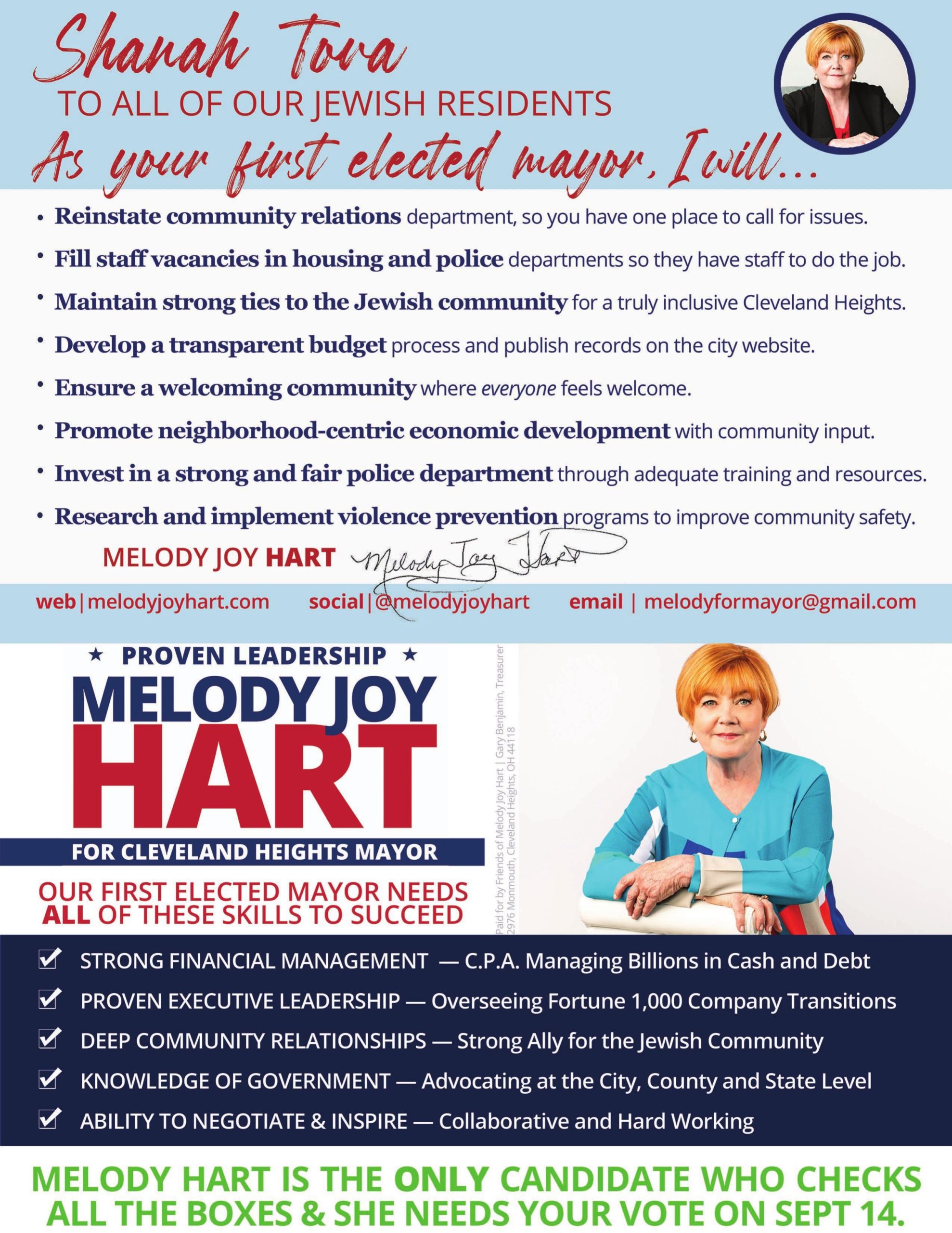 All have solid agendas and have reached out to our community with good ties, but it’s Hart’s grasp of issues important to us and her record on council that stand her apart. It’s worth mentioning that both women are seen as strong supporters of the police, and all candidates understand the problems that an empty Severence Mall creates. As a councilwoman, Hart has worked to bring the Taylor Tudor project to a point where some promise can now be seen from it. She has promoted the need for housing refurbishing in the DeSota Altemonte area and has reiterated the need to communicate with us, it’s neighbors, for input. Hart understands that there are subtleties our community would appreciate such as having the developer clued in on what makes a kosher kitchen appreciated by a Jewish family and has asked the developers to meet with and consider such standards. Most impressive was Hart’s understanding that some have created an atmosphere in their rhetoric when directed at our community about voucher usage that belies the city’s newly adopted theme of “All are Welcome” and Hart’s willingness to call it out. She also, in my opinion, has the stronger grasp in general of issues relevant to our neighborhood ranging from smaller ones like our need for more parking on Taylor instead of a the proposed bike lanes to larger ones like the development of the Milikin site and strengthening our business sector. Her record as a strong ally for our community and willingness to work closely with us should be appreciated. Vote Melody Hart