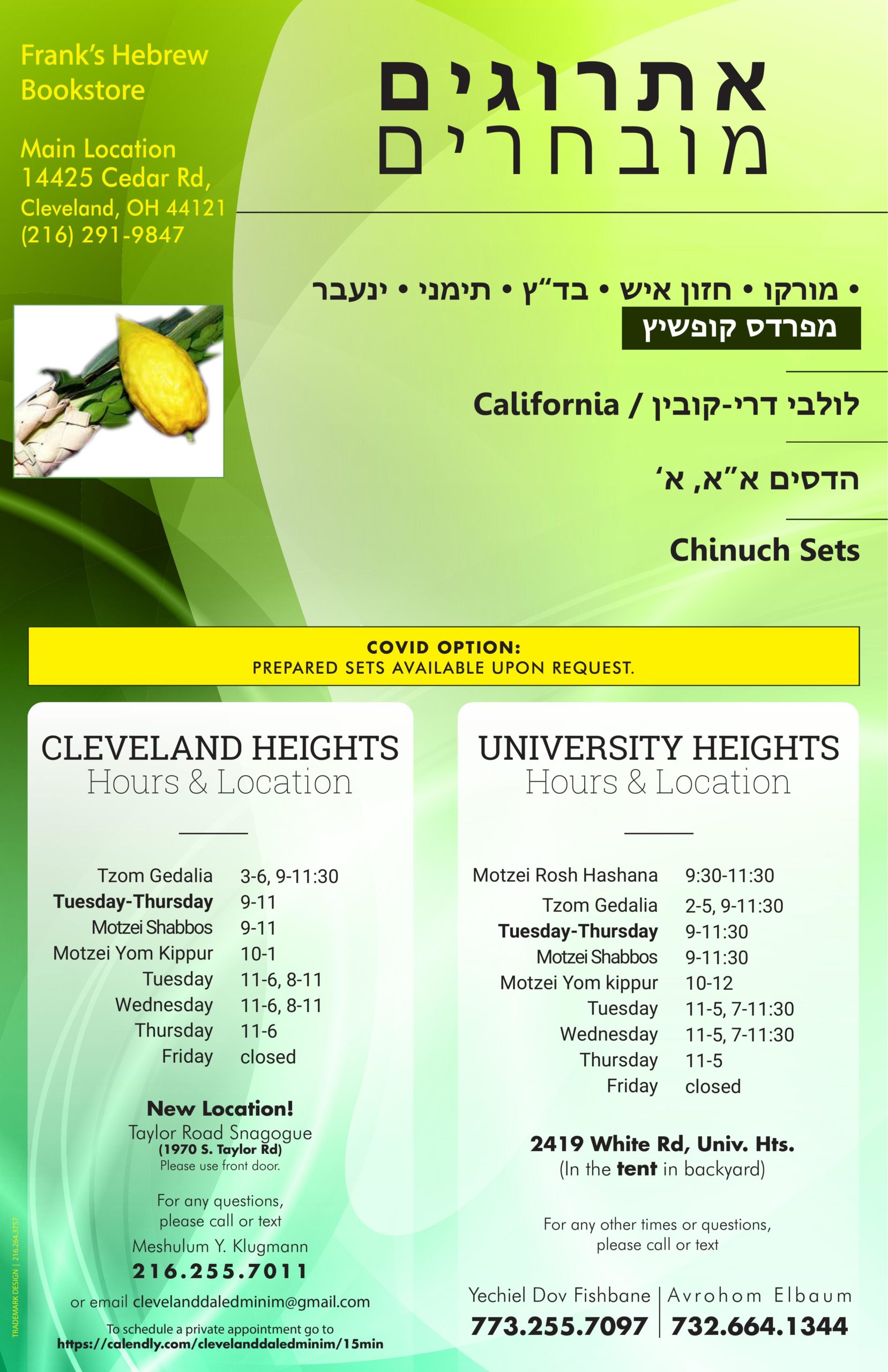 Daled Minim – Esrogim Muvcharim! Three Convenient Locations!