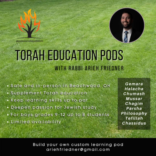 It’s been a very difficult 5 months (is that all it’s been) since the pandemic started. Trying to make plans has sometimes felt like trying to move forward in quicksand. As on of our highest priorities, Torah education needs to be established with consistency and administered in trust. That’s why I’m creating some time for Torah Education Pods in Cleveland.