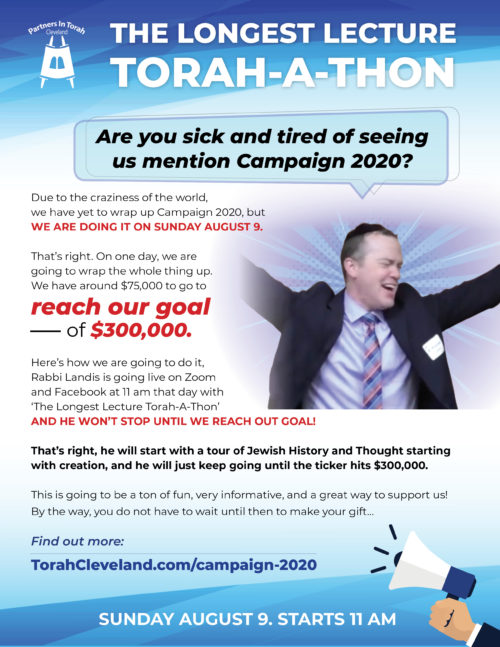 This Sunday, Rabbi Landis will be going live at 11 am for a tour through Jewish History and Thought starting with creation. When will he end? When the Partners In Torah Campaign 2020 goal is met! Find out more here: https://torahcleveland.