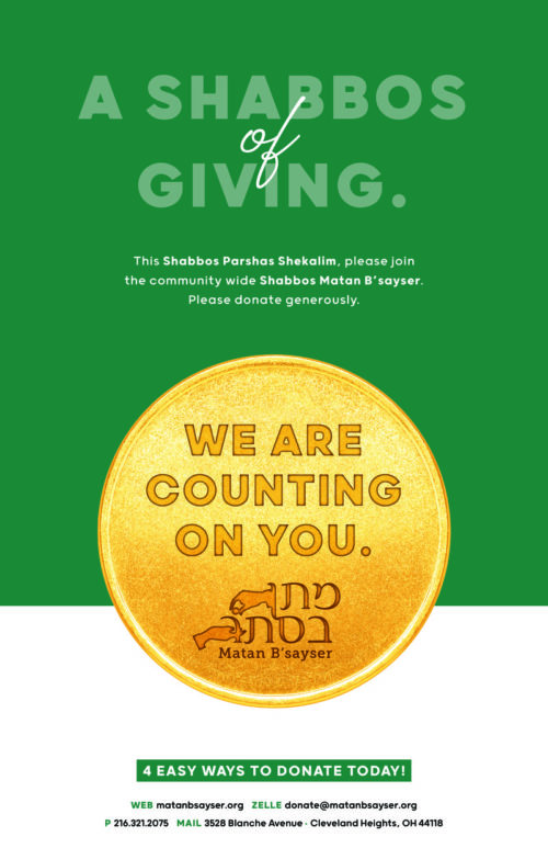 Your Matzah order will iy”H be available for pickup & payment at Khal Yereim – 1771 S. Taylor Rd. In Cleveland Heights on the evenings of March 25 & 26.