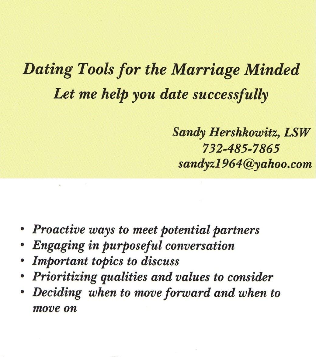 Contact Sandy Hershkowitz, LSW, at 732-485-7865 or sandyz1964@yahoo.com.