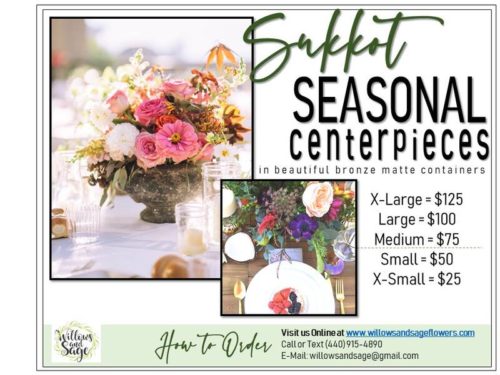 Act quickly to order your Sukkot florals today! We’re making gorgeous, seasonal centerpieces to deck your tables! Call or Text (440)915-4890 to place your order today or e-mail willowsandsageflowers@gmail.