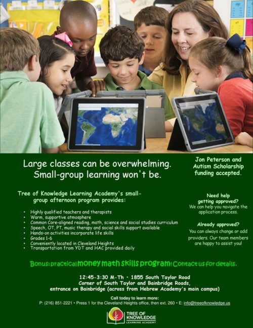 Tree of Knowledge offers a supportive, engaging afternoon small-group education program tailored to help each child thrive. We offer a fully accredited academic program that enables students to strengthen their skills in reading, math, science and social studies. Monday through Thursday, 12:45 pm – 3:30 pm. Transportation provided from HAC and YDT daily. Limited spaces available. Call today for more information or to register your child: (216) 851-2221, press 1 for the Cleveland Heights office, then dial ext. 260, or email info@treeofknowledge.us.