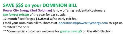 Power City Energy (Suri Goldman) is now offering residential customers the lowest pricing of the year for gas supply: 12 month fixed gas for $3.25mcf with no early exit fee.
