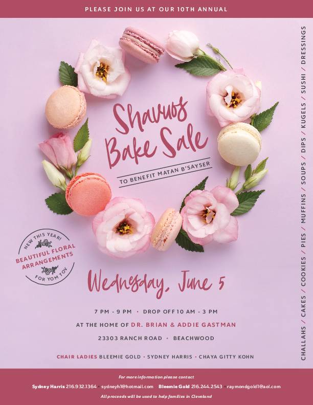 Matan B’Sayser 10th Annual Shavuos Bake Sale, Wednesday, June 5th