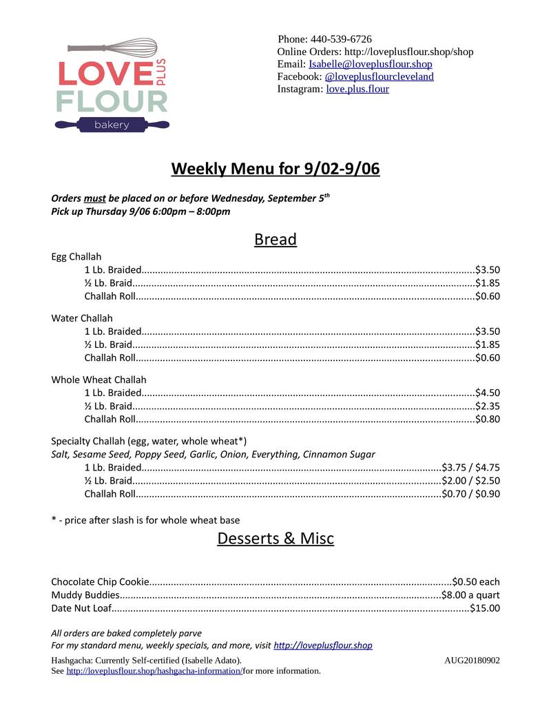 Today is the last chance for early bird orders for Yom Kippur and Sukkot (1st and 2nd days). Also, I hope to see you tomorrow (9/3) at the Gross Schechter Kosher Rib Burnoff from 12-4 pm. Meanwhile, this week I have some great offerings: classic chocolate chip cookies, Muddy buddies, and date nut loaf! As always I’ve got whole wheat, egg and water challah in multiple sizes and toppings are available as well.
