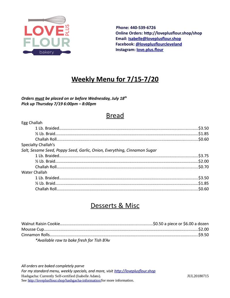 Love Plus Flour Weekly Menu for 7/15