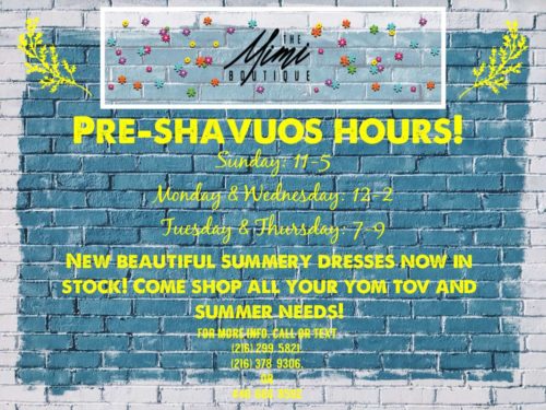Pre-Shavuos Hours at Mimi Boutique 2!