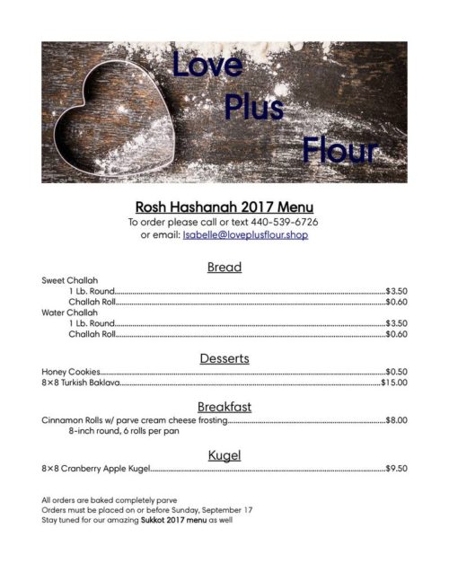 LovePlusFlour bakery is open for business and ready to help you create a sweet start to your family’s new year with a select menu of freshly-baked breads, desserts, kugels and breakfast items (all pareve). Everything baked fresh for pickup. Vegan options available. Visit http://www.loveplusflour.shop for details.