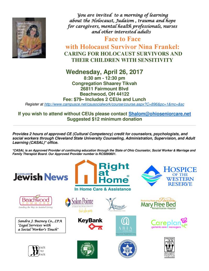 Face to Face with Holocaust Survivor Nina Frankel: “Caring for Holocaust Survivors and their Children with Sensitivity” (2 CE Credits)